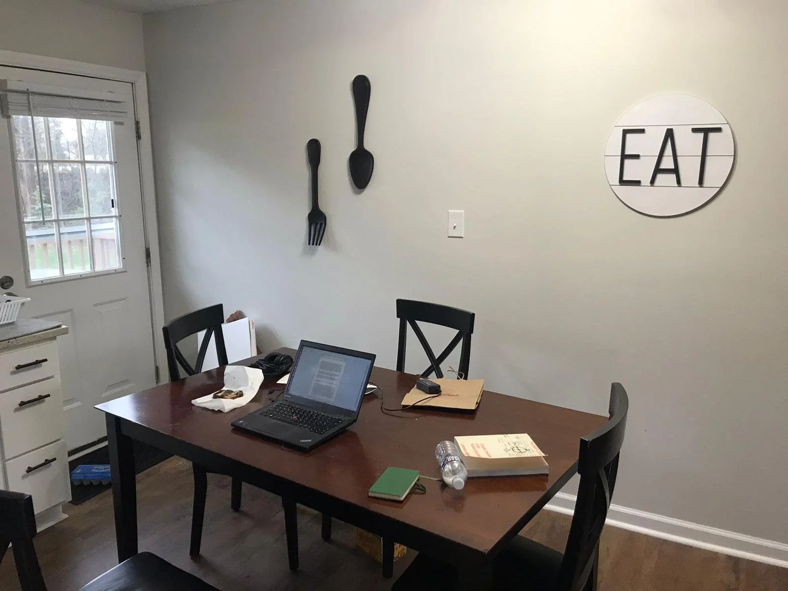 On the wall of the air BnB bungalow I’m staying in is a clear kitsch instruction - ‘EAT’ - the command is shouted at me in capital letters on a circular backing, made to look like it’s constructed from wooden slats, but also to look like a plate? - it is neither created ‘artfully’ from recycled wood nor is it a plate. Maybe it’s not meant to be a plate? Maybe it’s just a white circular backdrop for what someone must have thought would be an endearing word for me to meditate on whilst in the kitschen-livingroom. But I know it’s meant to be a plate because next to it an oversized spoon and fork hang from the wall – these too are reproductions, plastic I guess, and painted with a wood-grain effect to appear as though they have been hand-carved.