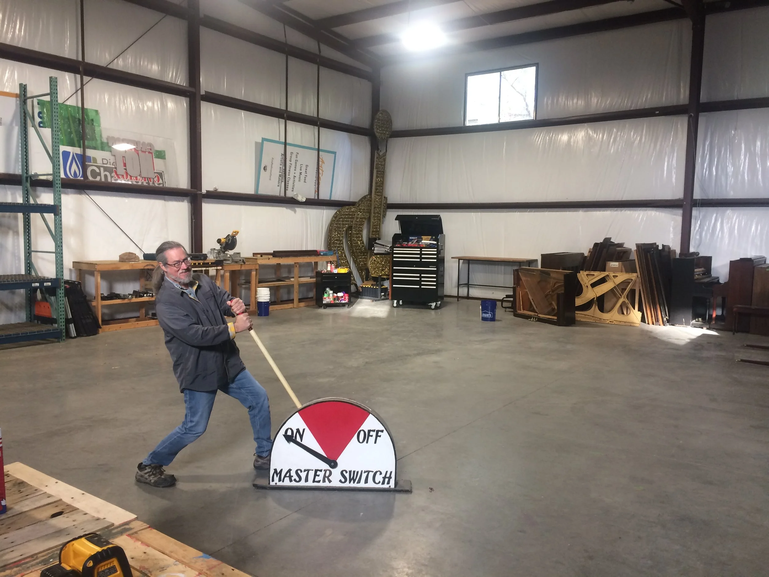 Already the warehouse filled with festival floats, theatre sets, tools, shelves of boxes of assorted stuff from various past projects and an enormous pumpkin feels a like home from home. Greg and I pose with an outsized lever with the words ‘off / on’. This is going to be fun.