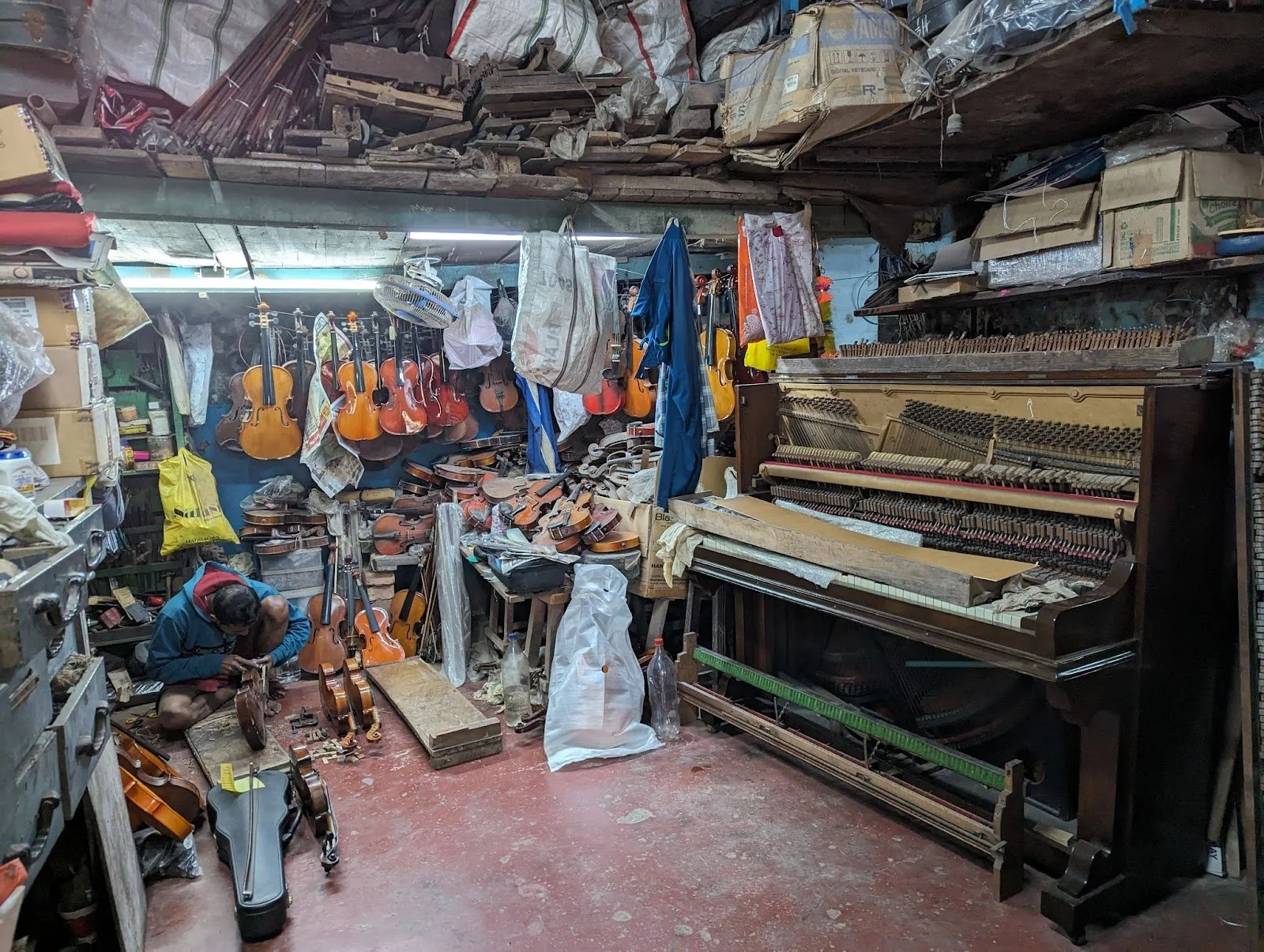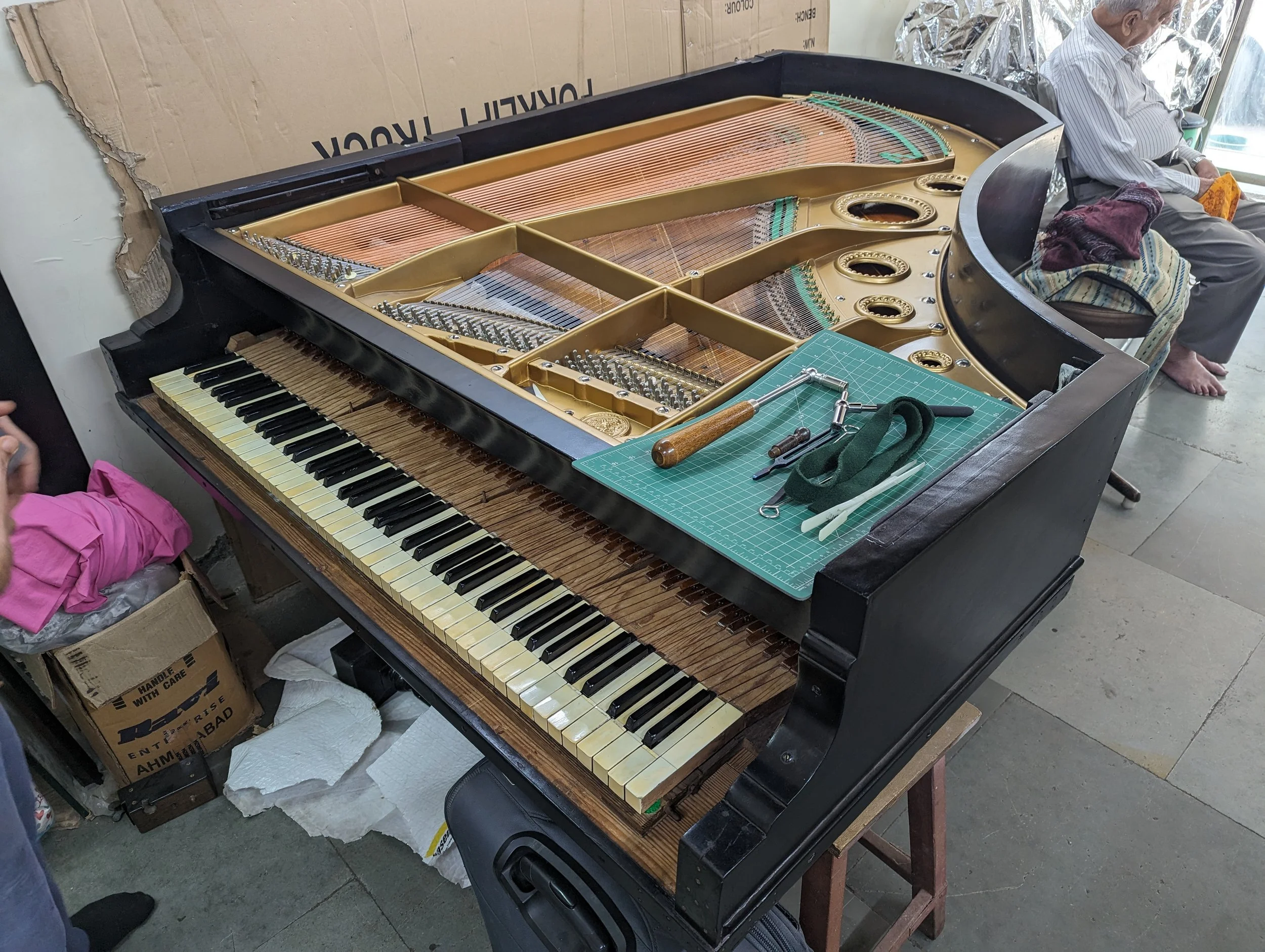 Today we started pulling pianos apart. After all the years of planning, the months of anticipation, the weeks of preparation and the days of travelling it’s great to finally be here and hands on.