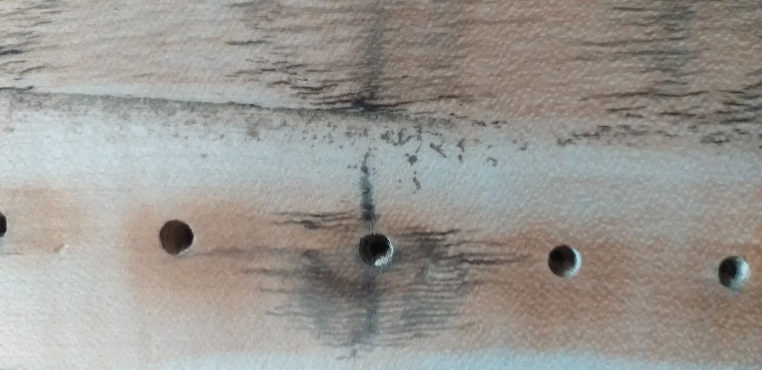 The wood is typically a shimmering, sallow beech, areas covered by the harp are a pale yellow, almost a fleshy pink, bruised where screws once dug in. The relative peace of this zone is broken by turbulent exposed areas which take on caramel tones. Grey forms ripple through the wood, reflecting something unseen onto its surface. A swirl of black eddies around the vortex of those pin holes. Closer inspection reveals a calm sea at night, with a lighthouse in the background, all captured in the space of a thumbnail. There seems no end to the landscapes found here.