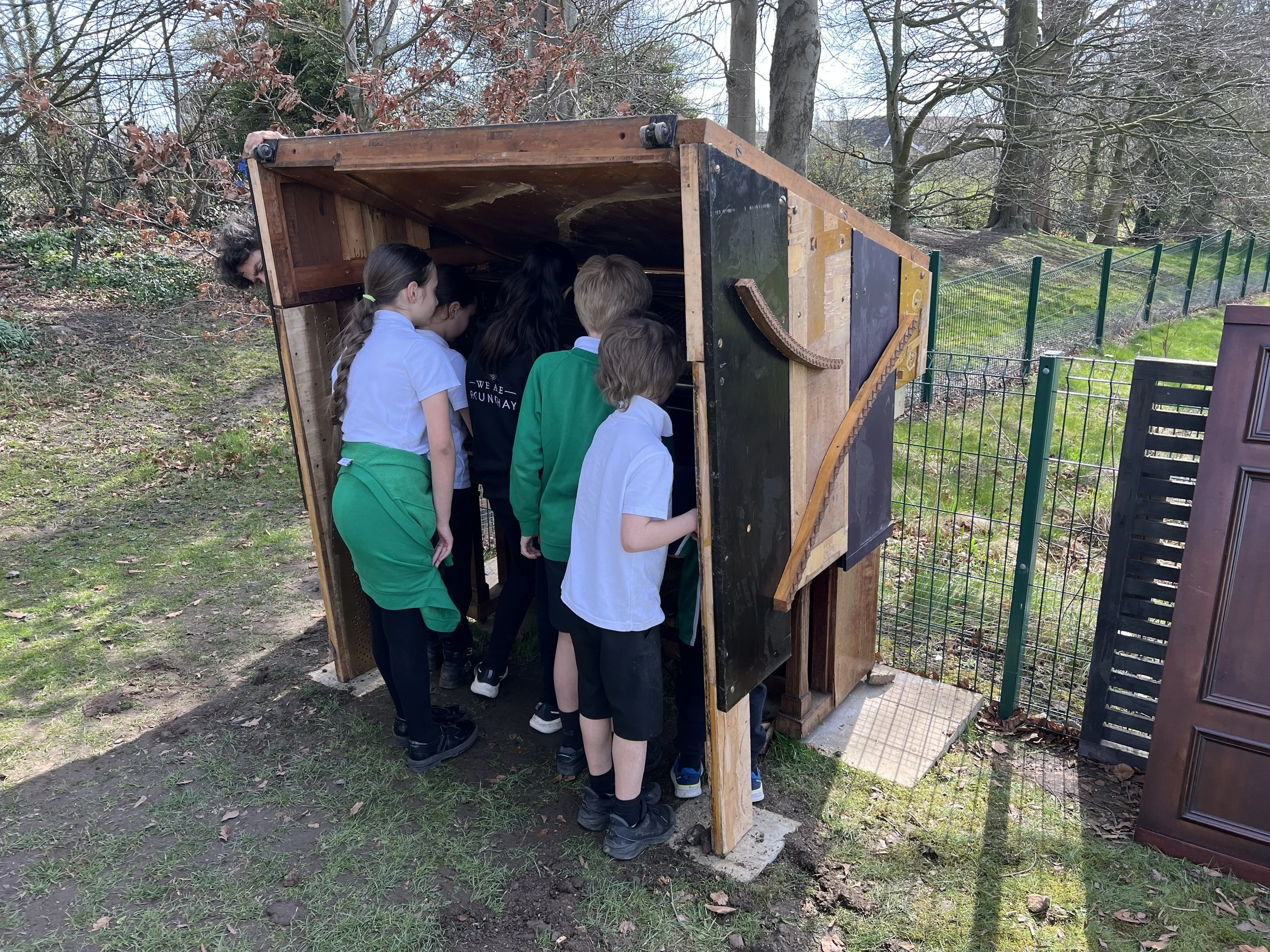 Surrounded by an excited group of children, distracted by ladybirds and sticks, the shed, made entirely from reclaimed piano wood, started to take shape. Tim's creative vision coming to life, Matt, Tom and Shona creatively supporting; digging required for stone slabs, saws required for adjustments, conversation and answers for endless children's questions. This is their beginning...the adventure of planting and growing on it come next. Little minds whirling.