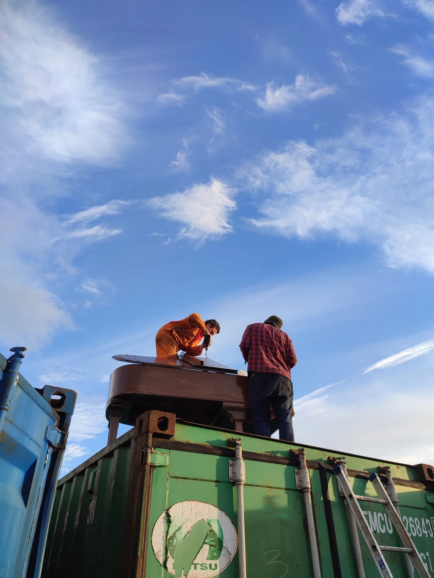 Tim and Tom keeping the lid on a container-mounted grand, Granton