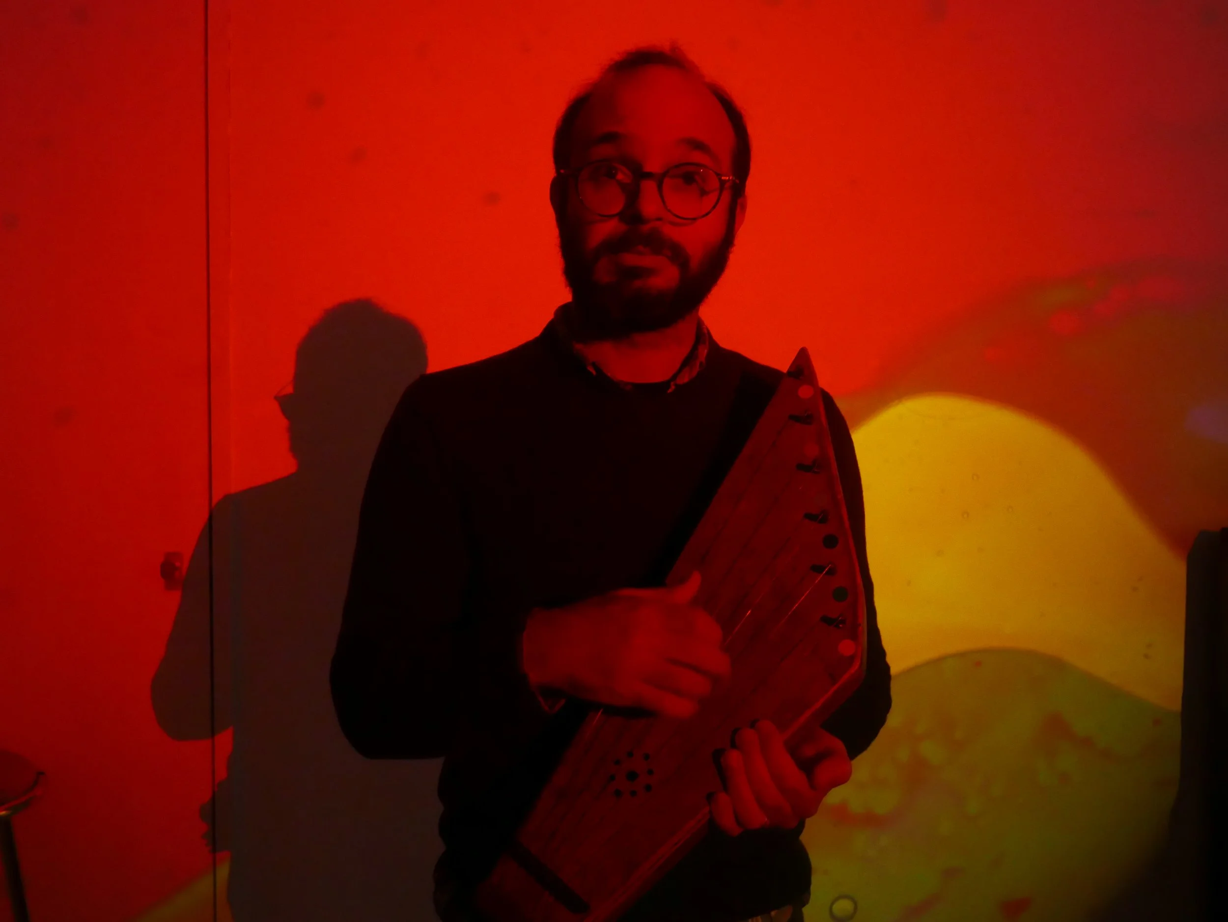 An expanded ensemble with live visuals, presenting extended material from the forthcoming album All Things Ecstatic. Featuring homemade stringed instruments, clarinet, unsynchronised loops, and lo-tech gadgetry to create kaleidoscopic digitally enhanced modal improvisations.Pianodrome Bruntsfield